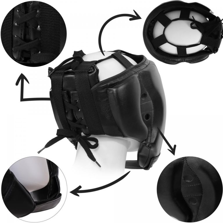 Pohodlná syntetická koža obklopuje hlavu a chráni ju polstrovaním hrubým 3 cm. Dvojité šnurovanie na hornej časti hlavy a na zadnej strane zabezpečuje bezpečné upevnenie aj pri najtvrdších úderoch. Prilba je tiež vybavená suchým zipsom pod bradou.