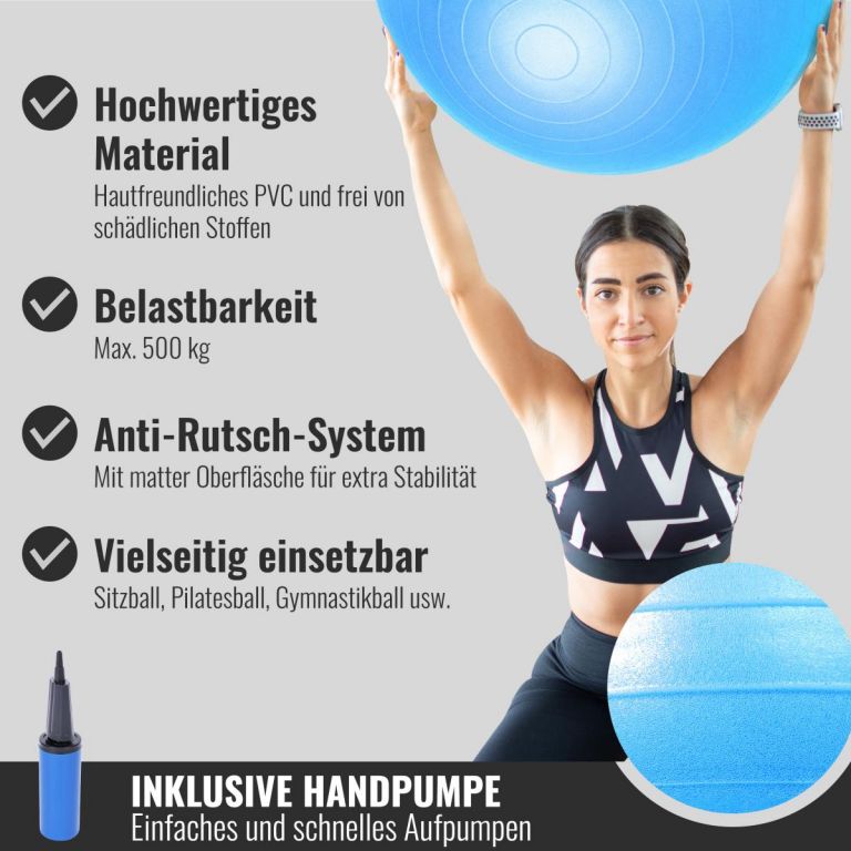 Lopta na cvičenie je jedným z najuniverzálnejších fitness zariadení. Môžete ju použiť doma, v kancelárii alebo na cestách ako loptu na sedenie alebo ju integrovať do vášho tréningu. Možnosti s loptou na cvičenie sú nekonečné a ponúkajú vám skvelú príležitosť efektívne precvičiť svoje telo. Matná cvičebná lopta je vďaka anti-burst systému extrémne odolná a môže prasknúť len v extrémnych podmienkach. Cvičíte tak s maximálnou bezpečnosťou a môžete sa plne sústrediť na svoj tréning.