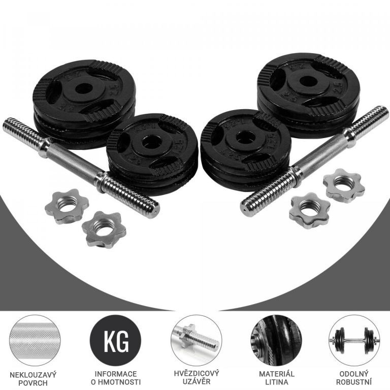 Tréning s činkami má svoje miesto takmer v každom tréningovom pláne. Praktické úchyty zaisťujú dodatočnú bezpečnosť záťažových kotúčov. Sada činiek v čiernej farbe zaujme aj svojím jednoduchým dizajnom. Označenie KG je na všetkých kotúčoch. Otvor je vhodný pre všetky štandardné tyče s priemerom 30 mm.