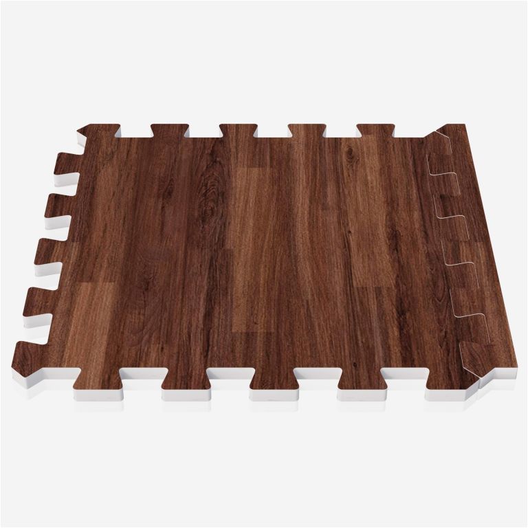 Fitness podložka s motívom tmavého dreva chráni podlahu a tlmí hluk. Jednoduchá montáž, univerzálne použitie.