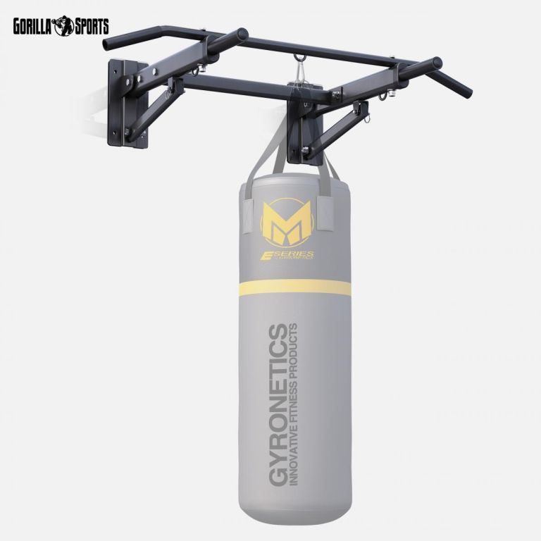 Skladacia nástenná hrazda Gorilla Sports s pogumovanými rukoväťami a príslušenstvom pre boxovacie vrecia alebo expandéry. Šetrí miesto a zároveň zvlád