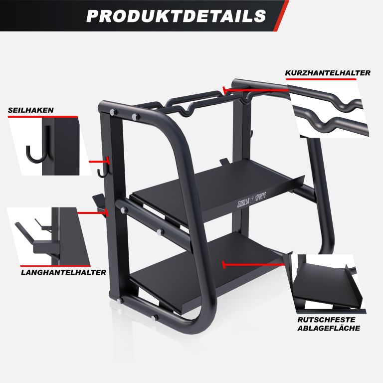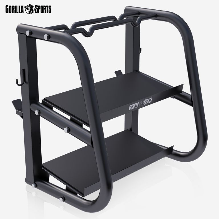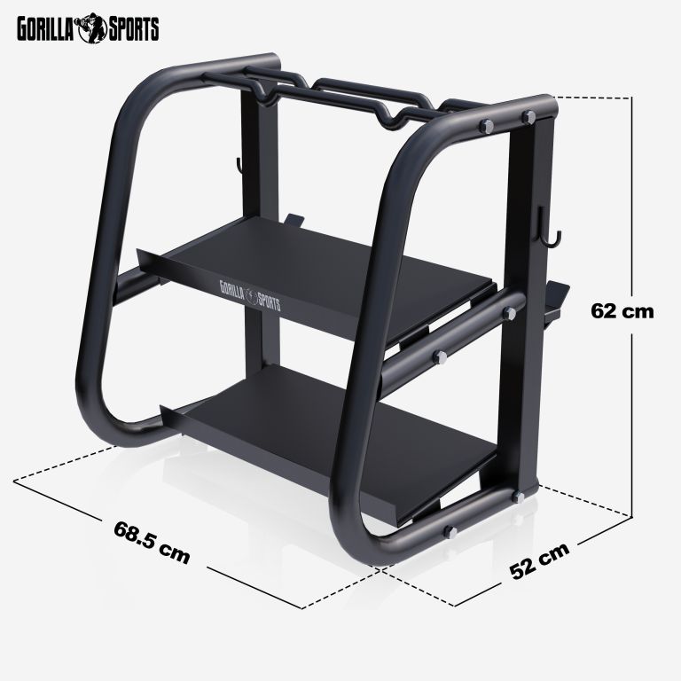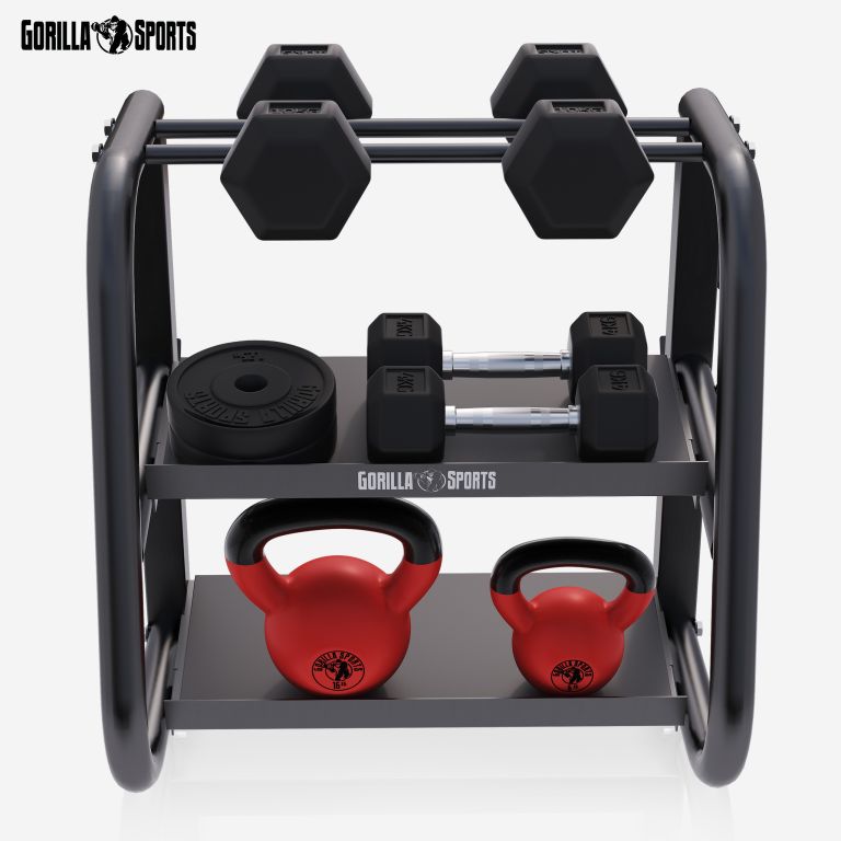 Udržujte poriadok a štýl vo svojej domácej posilňovni vďaka stojanu na činky Gorilla Sports. Všetky vaše činky, kettlebell aj osy budú vždy na svojom mieste a pripravené na použitie. Kompaktné dvojúrovňové vyhotovenie šetrí miesto a zároveň dodá vášmu tréningovému priestoru moderný vzhľad.