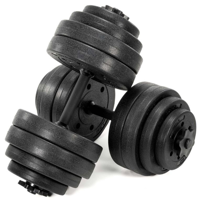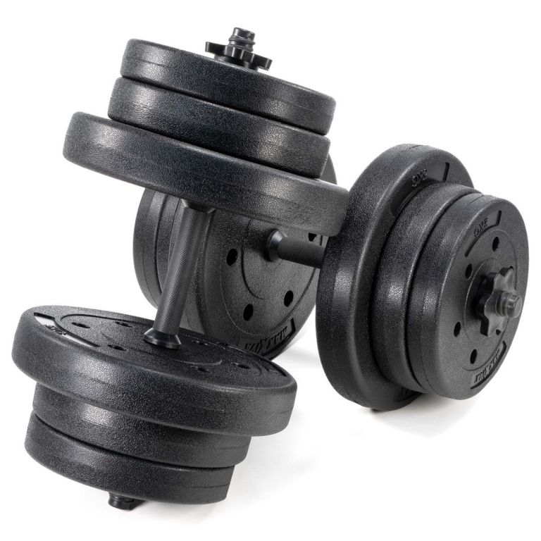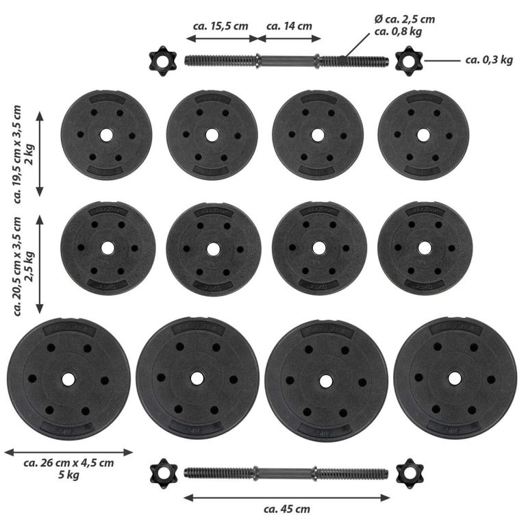 Nezáleží na tom, či trénujete paže, chrbát, brucho alebo bicepsy - naša sada činiek je univerzálna. 2 činky s bezpečným úchopom vyrobené z vysoko kvalitného plastu pre bezpečné a pohodlné cvičenie. Vďaka plastovému poťahu sú tieto závažia šetrné k podlahe a v kombinácii s cementovou výplňou sú tichšie než bežné činky. Štvorhviezdičkové skrutkové zámky spoľahlivo fixujú závažia. Rukoväte s krížovým vrúbkovaním podporujú bezpečnosť pri silovom tréningu. To umožňuje tréningovú hmotnosť 20 kg na činku, ktorú môžete meniť podľa svojej osobnej tréningovej úrovne.
