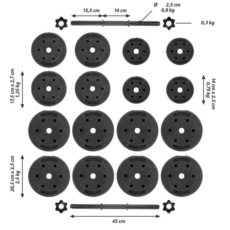 Ak chcete budovať svaly, trénovať alebo len zostať fit, naša sada činiek je tou správnou voľbou. Nezáleží na tom, či trénujete paže, chrbát, brucho alebo biceps – táto sada činiek je univerzálna. Tieto činky sú ideálne pre vašu domácu posilňovňu. Vďaka plastovému poťahu chránia tieto závažia vašu podlahu av kombinácii s cementovou výplňou sú tichšie ako bežné činky. Štvorhviezdicové skrutkovacie uzávery spoľahlivo zafixujú závažia a rukoväte. Ryhované držadlá navyše podporujú bezpečnosť pri silovom tréningu.