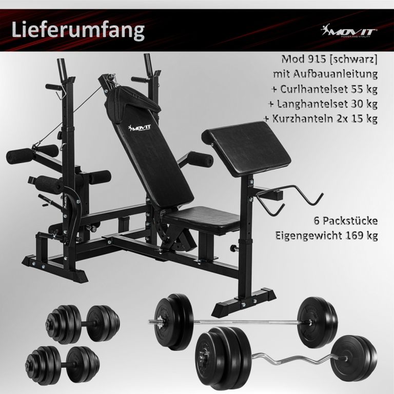 Kombinovaná dlhá a šikmá lavica, viacnásobne nastaviteľné operadlo a stojan na činky, integrovaný modul káblovej kladky, dve rukoväte, dva stojany na zadnej strane pre vybavenie, pogumované stabilné nožičky. Dlhý stojan na činky (až 180 kg), motýlie ramená (každé až 40 kg), ľahko vymeniteľný stojan na kotúče a kliešte na nohy (až 60 kg). To všetko a oveľa viac obsahuje náš set. Naše jednoručné činky sú veľmi univerzálne. Nielen na precvičenie bicepsov a tricepsov, ale aj napríklad chrbtových a brušných svalov. Obsahujú trapézovú skrutku na bezepčené upevnenie kotúčov. Činkový set 30 kg vám pomôže vypracovať pevné svaly a udržať sa vo forme. S touto sadou budete ideálne vybavení na mnohé silové cvičenia. Činky sú vrúbkované, aby sa zabránilo nepríjemnému skĺznutiu. S činkou 55 kg formujete nielen svoju postavu, ale aj posilňujete vaše svaly a rozvíjate svoju silu. Hviezdicovité uzávery zaisťujú, že závažia sa vždy pevne a bezpečne pripevnia na činky. Zabraňujú nepríjemnému pádu a súvisiacemu možnému zraneniu. Aby sa zabránilo skĺznutiu rúk pri tréningu, sú tu miesta určené na držanie. Činka má dva nezničiteľné lichobežníkové závity - najbezpečnejší spôsob, ako zaistiť kotúče.