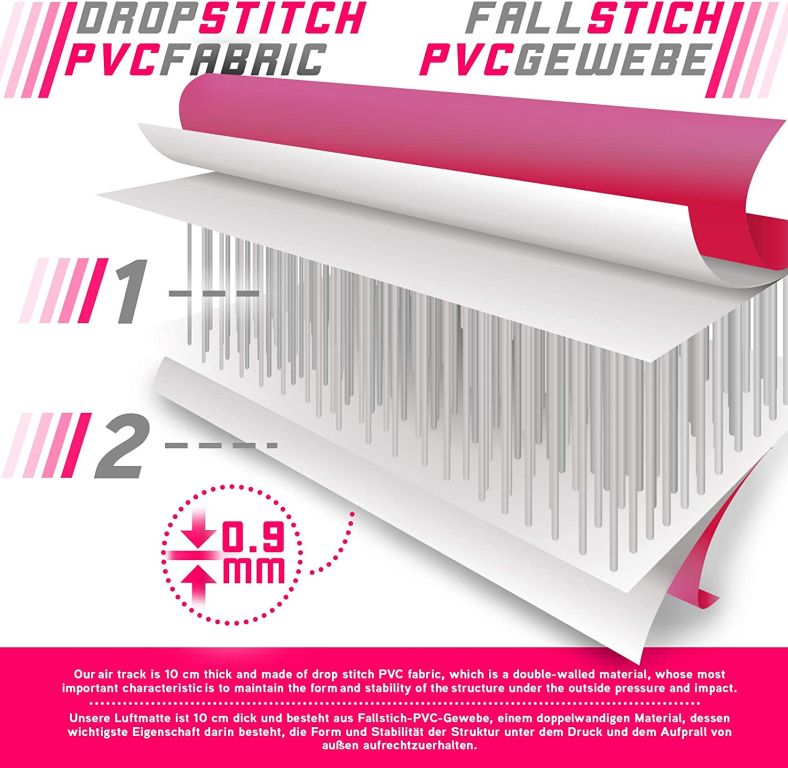 Naša cvičebná podložka je hrubá 10 cm a je vyrobená z plachty z PVC, materiálu s dvojitou stenou, ktorého hlavným rysom je udržanie tvaru a stability konštrukcie pod vonkajším tlakom a nárazmi. Táto podložka je vybavená elektrickým vzduchovým čerpadlom a opravnou sadou. Je vhodná pre rôzne vnútorné i vonkajšie športy.