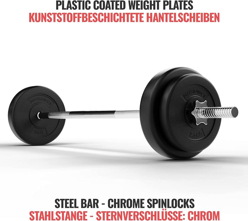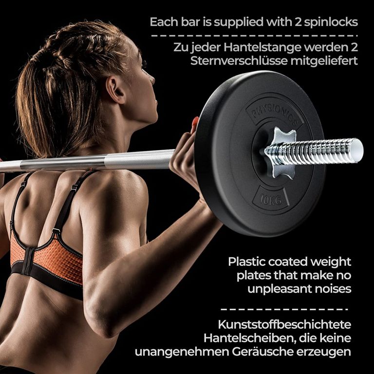 Zohľadnite svoje osobné ciele a schopnosti a prispôsobte túto sadu Vášmu tréningovému plánu. Dve 20 cm dlhé rukoväte na dlhej činke majú protišmykový povrch, ktorý zaisťuje, že sa Vaše ruky nešmýkajú z tyče. Záťažové kotúče sú naplnené cementom a sú vybavené odolným plastovým poťahom, ktorý nepoškodí podlahovú krytinu.