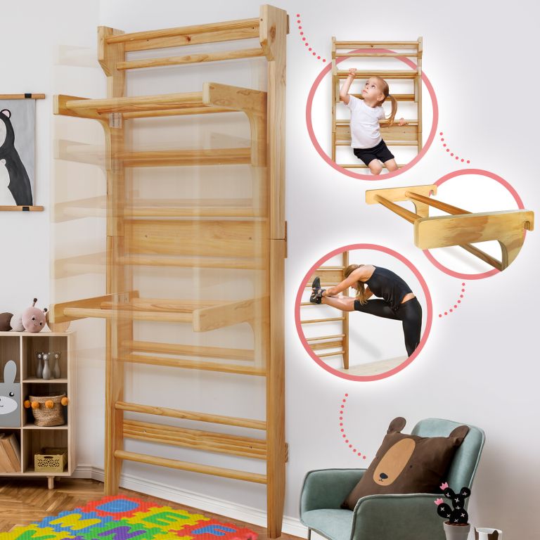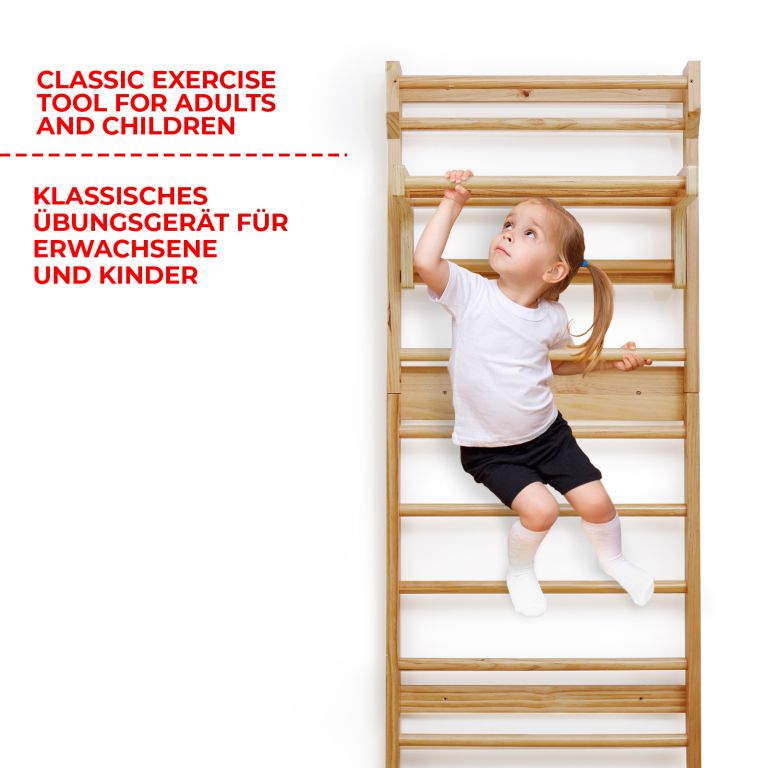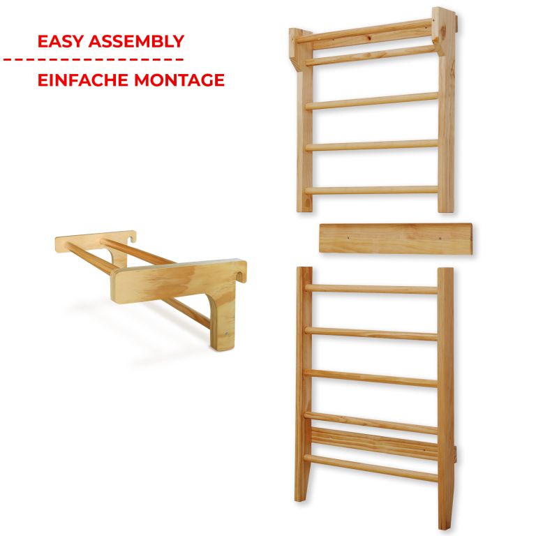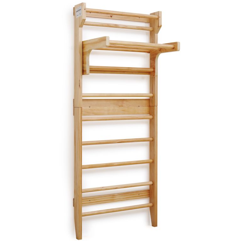Fitness rebriny z robustného dreva a posuvnou hrazdou, sú spoľahlivým a odolným zariadením. Vhodné náčinie pre rôzne športy a naťahovacie cvičenia, najmä pre terapeutické cvičenia, ktoré môžu zmierniť bolesti chrbta a ďalšie problémy. Výhodou je posuvná hrazda, ktorú môžete zavesením upevniť do výšky podľa Vášho výberu a rozšíriť tak škálu vykonávaných fitness cvičení. Upevňovacie prvky na stenu nie sú súčasťou dodávky.