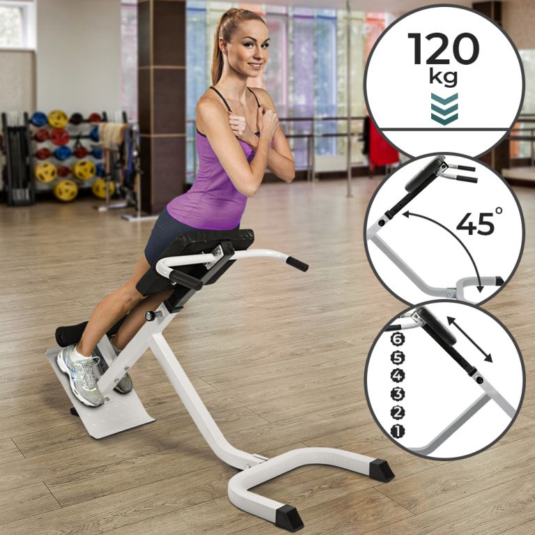 Náš skladací trenažér na chrbát vám umožní trénovať chrbát bez toho, aby ste museli platiť za posilňovňu. Je skladací, má 6 polôh nastavenia výšky, má práškovane lakovanú konštrukciu a jeho praktické oporné úchyty zaisťujú stabilitu. Polstrované a výškovo nastaviteľné upevnenie nôh, kde kolieska sú z peny s vysokou hustotou. Polstrovaný a štvorsmerne výškovo nastaviteľný chrbtový vankúš. Efektívne cvičenie vďaka uhlu 45 °.