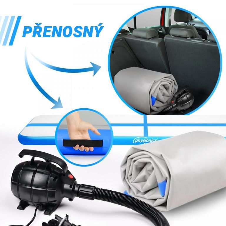 Naša gymnastická žinenka je 10 cm hrubá a je vyrobená z PVC plachty, dvojstenného materiálu, ktorého hlavnou vlastnosťou je udržať si tvar a stabilitu konštrukcie pri vonkajšom tlaku a nárazu. Tento komplet je vybavený elektrickou vzduchovou pumpou a sadou na opravu.