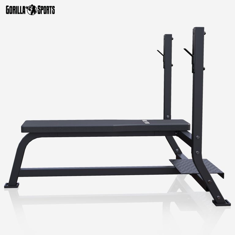 Široká bench lavica Gorilla Sports s odkladacími stojanmi
