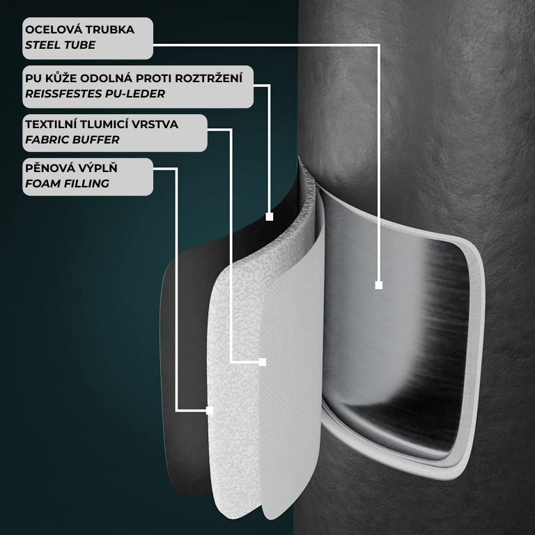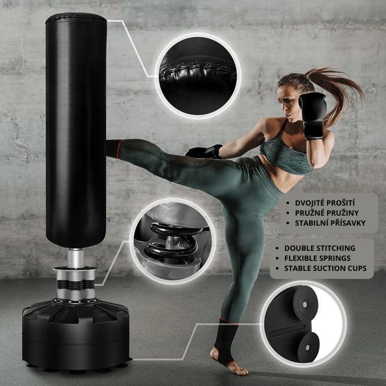 Masívna základňa s 12 prísavkami a možnosťou naplnenia vodou či pieskom zaručuje maximálnu stabilitu aj pri silných úderoch. Pružinový mechanizmus so štyrmi oceľovými pružinami zaisťuje realistický odpor a rýchly návrat vreca do pôvodnej polohy. Boxovacie vrece je ručne šité z odolnej PU kože a nylonu, čo garantuje dlhú životnosť a komfortný tréning bez nutnosti montáže na stenu alebo strop.
