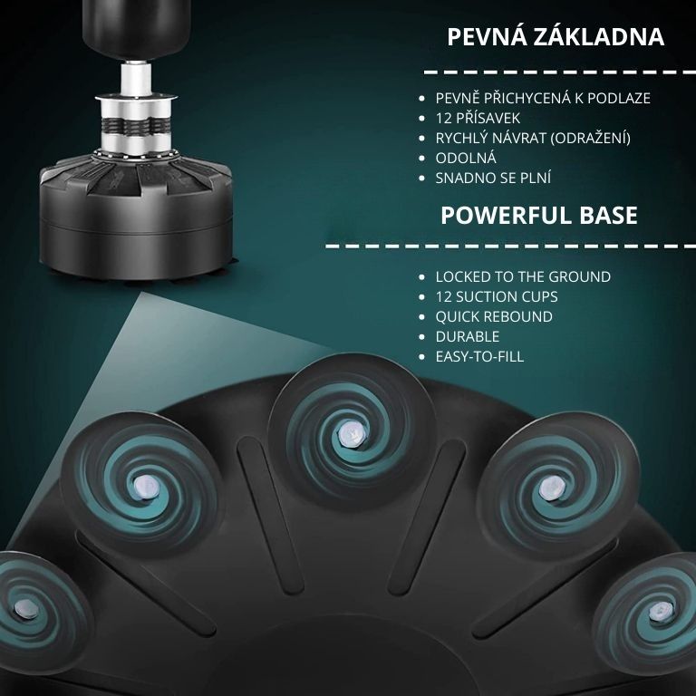 Zobraziť podrobnejší popisTréning kedykoľvek a kdekoľvek – voľne stojace boxovacie vrece s 12 prísavkami zaistí stabilitu aj bez montáže.